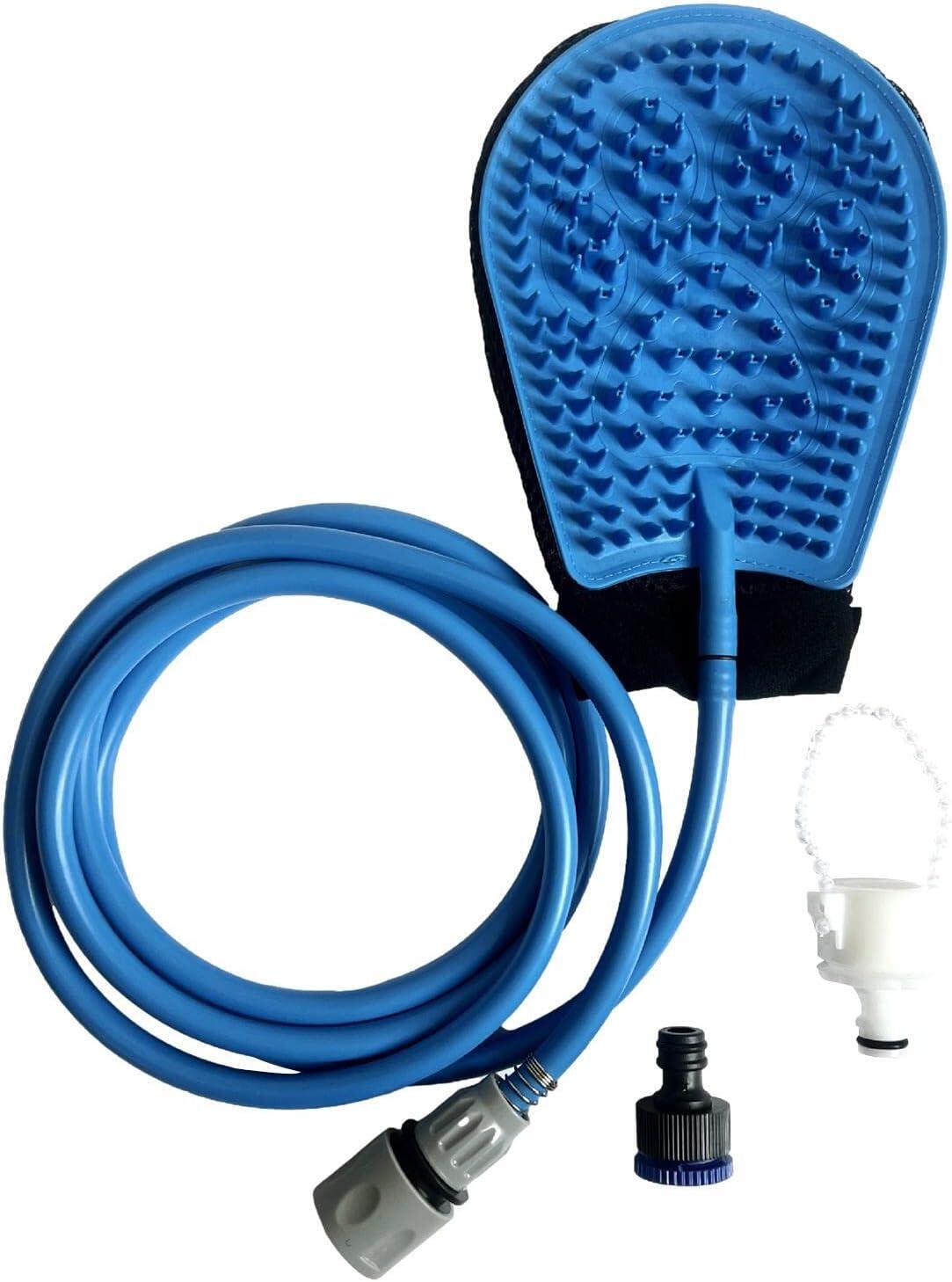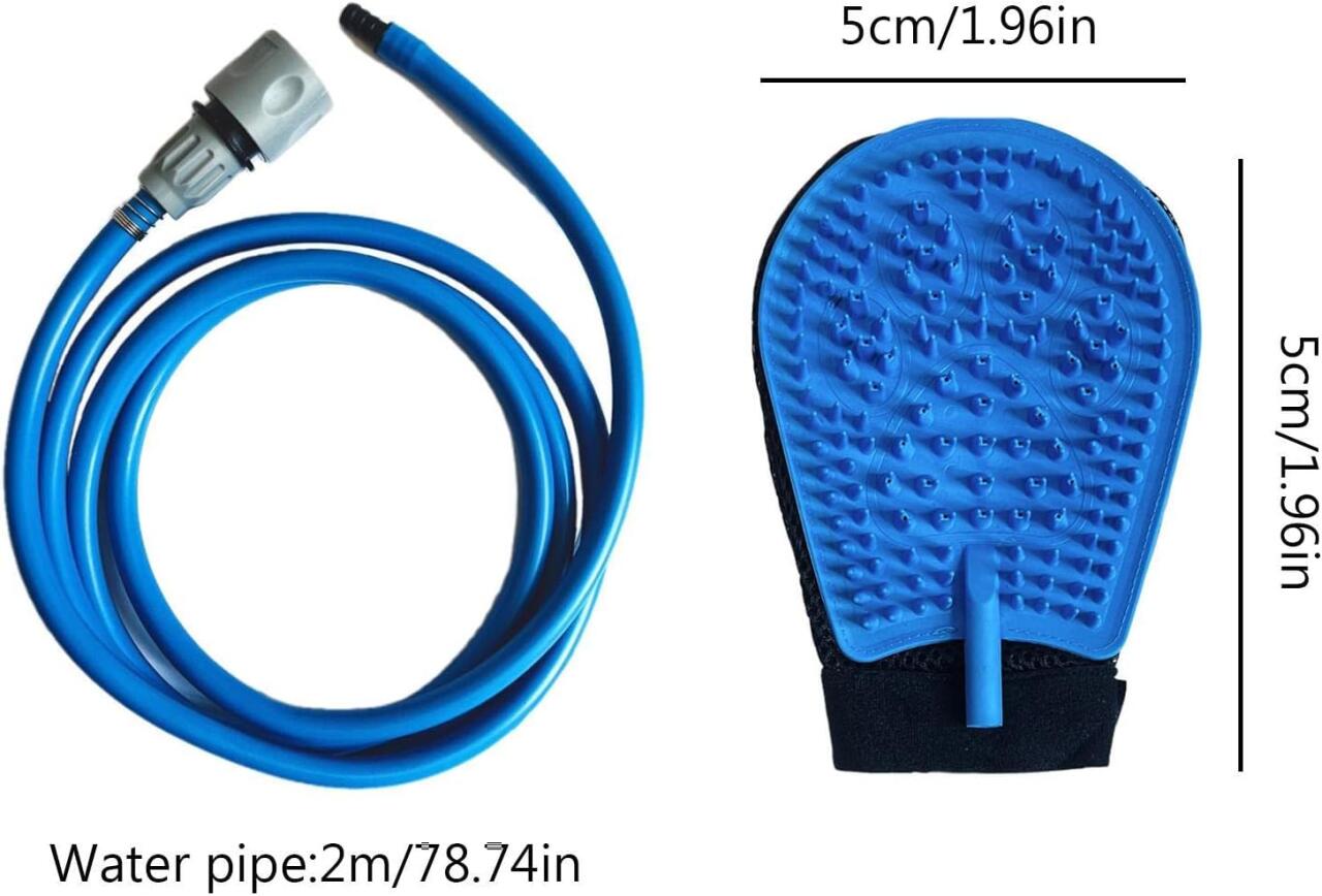 Guante para limpiar mascotas, específicamente diseñado para el baño y el cepillado de mascota. El guante está hecho de silicona flexible y resistente, con cerdas de goma en la superficie que ayudan a masajear y limpiar a fondo el pelaje de la mascota. El guante está diseñado para ser cómodo de usar, adaptándose a la forma de la mano y asegurando un buen agarre durante el uso. Este guante puede ser utilizado tanto en seco como en mojado, lo que lo hace ideal para el baño y el cepillado diario de la mascota. Viene con una manguera y conectores que permiten acoplar el guante a una fuente de agua, facilitando el proceso de lavado.